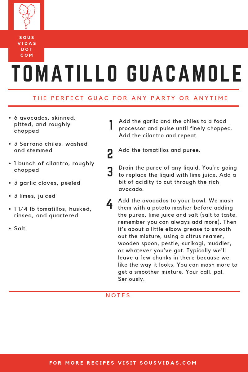 You can’t really halve the puree here. If you want to make less guac, you’re better off making the full puree and halving it before adding it to less avocado. We also advise buying about 1 1/4lb of tomatillos. You never know what’s under the husk, and sometimes tomatillos look fine and are totally weird.