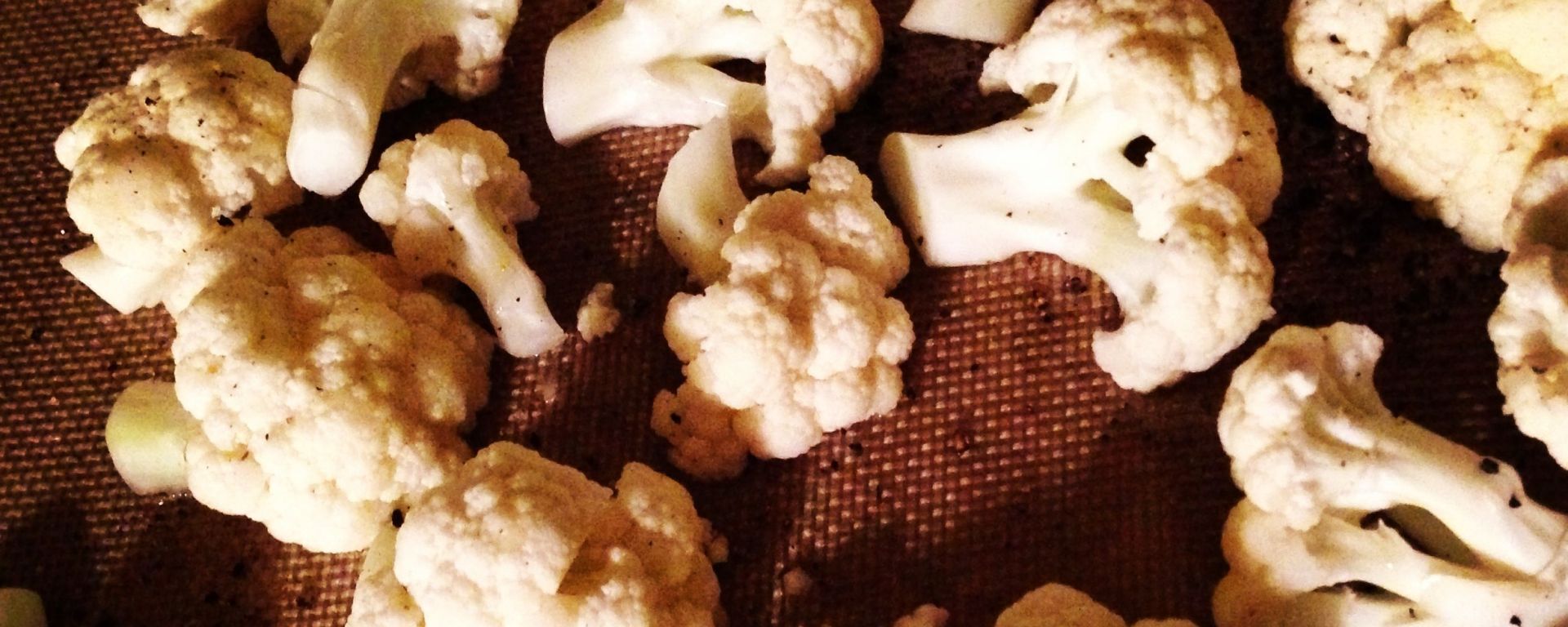 Preheat the oven to 500 degrees F. Break up the cauliflower into like sized florets. Toss the cauliflower with oil (about 2T), season with salt and pepper. Spread them on a greased pan (I use a Silpat non-stick silicone baking mat, I dig it).