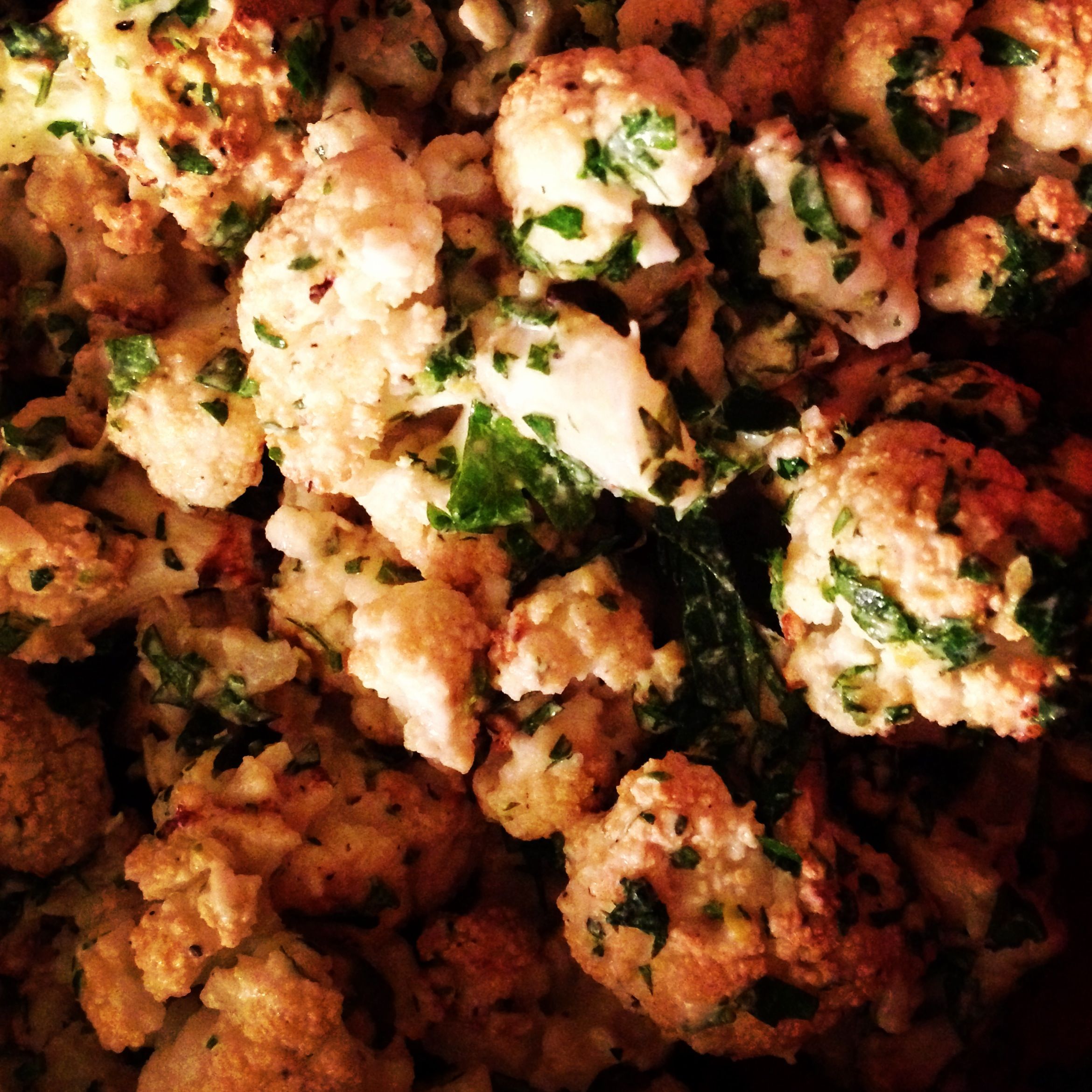 When the cauliflower is done, toss it with the sauce, parsley and zest. Divide onto plates and sprinkle with toasted sesame seeds. We had this as a side, and then mixed the leftovers into a pasta for Dad. After we ate most of them, chilled.