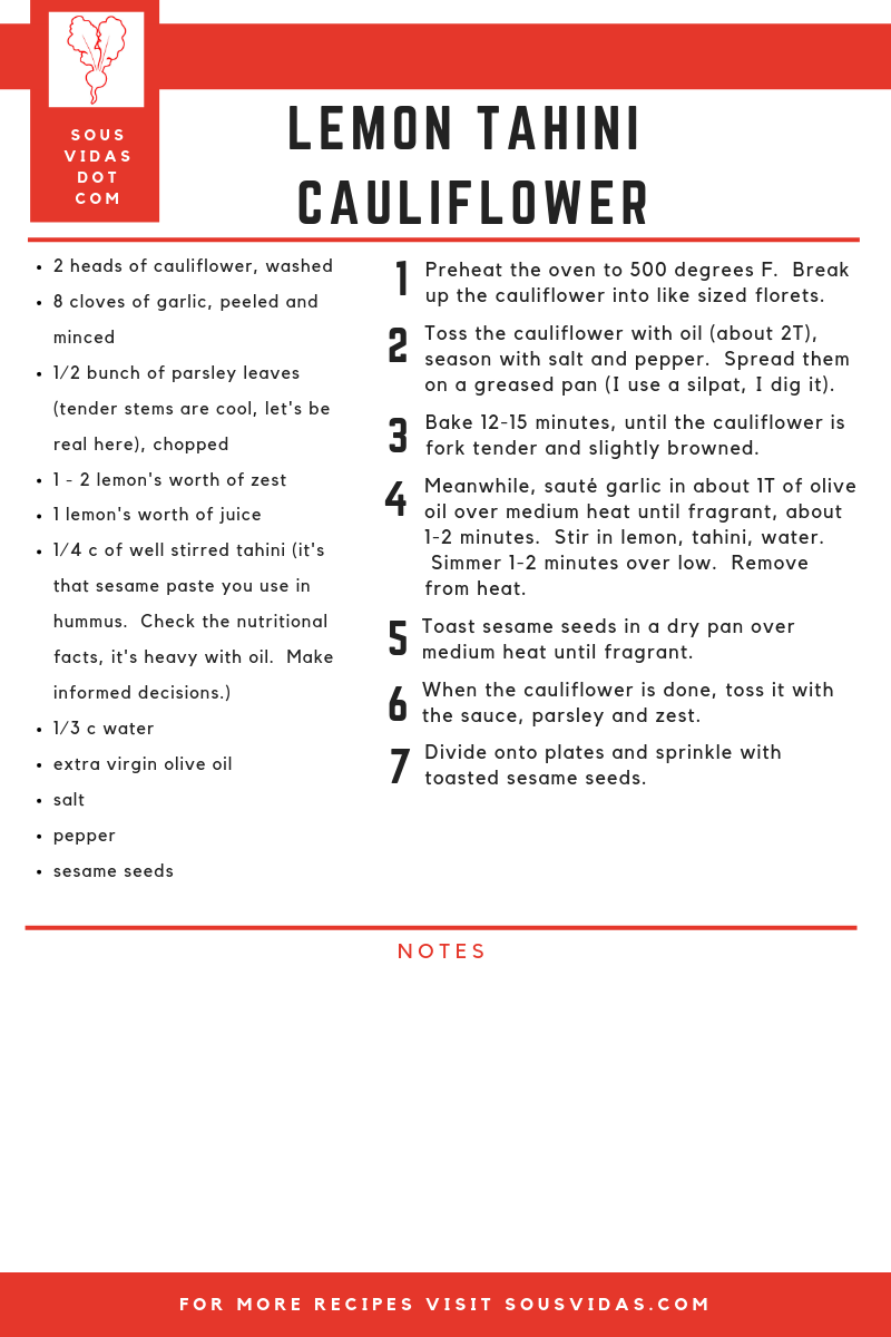 I recently went on a work trip with my husband, and one of his coworkers recommended a gourmet sausage restaurant for lunch. I told that story to tell this story: we had a tahini glazed roasted cauliflower. It was really good. I dismissed cauliflower, figuring it was the less nutritious version of broccoli, and broccoli and I have an uneasy alliance at best.