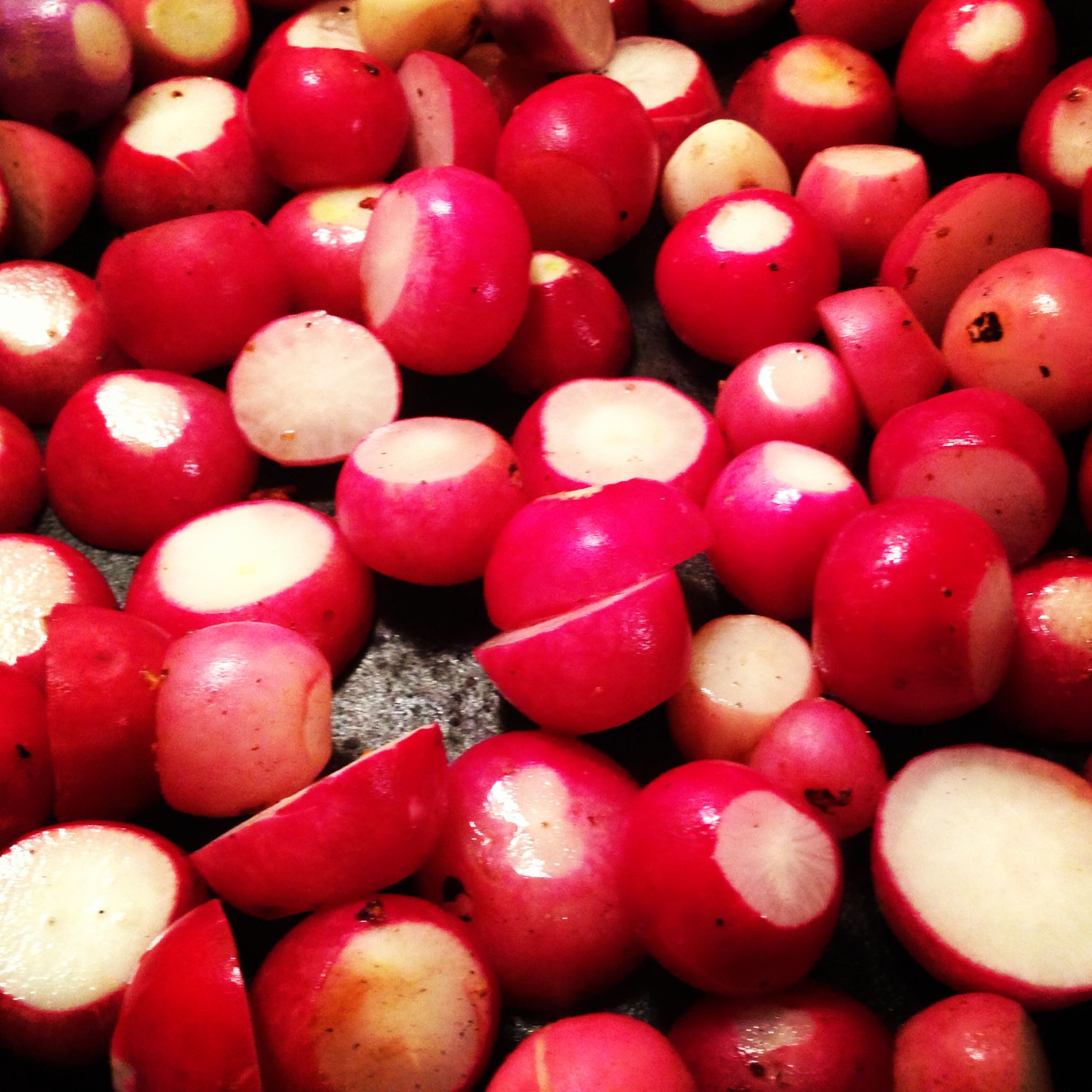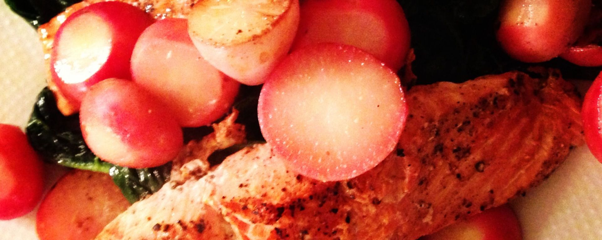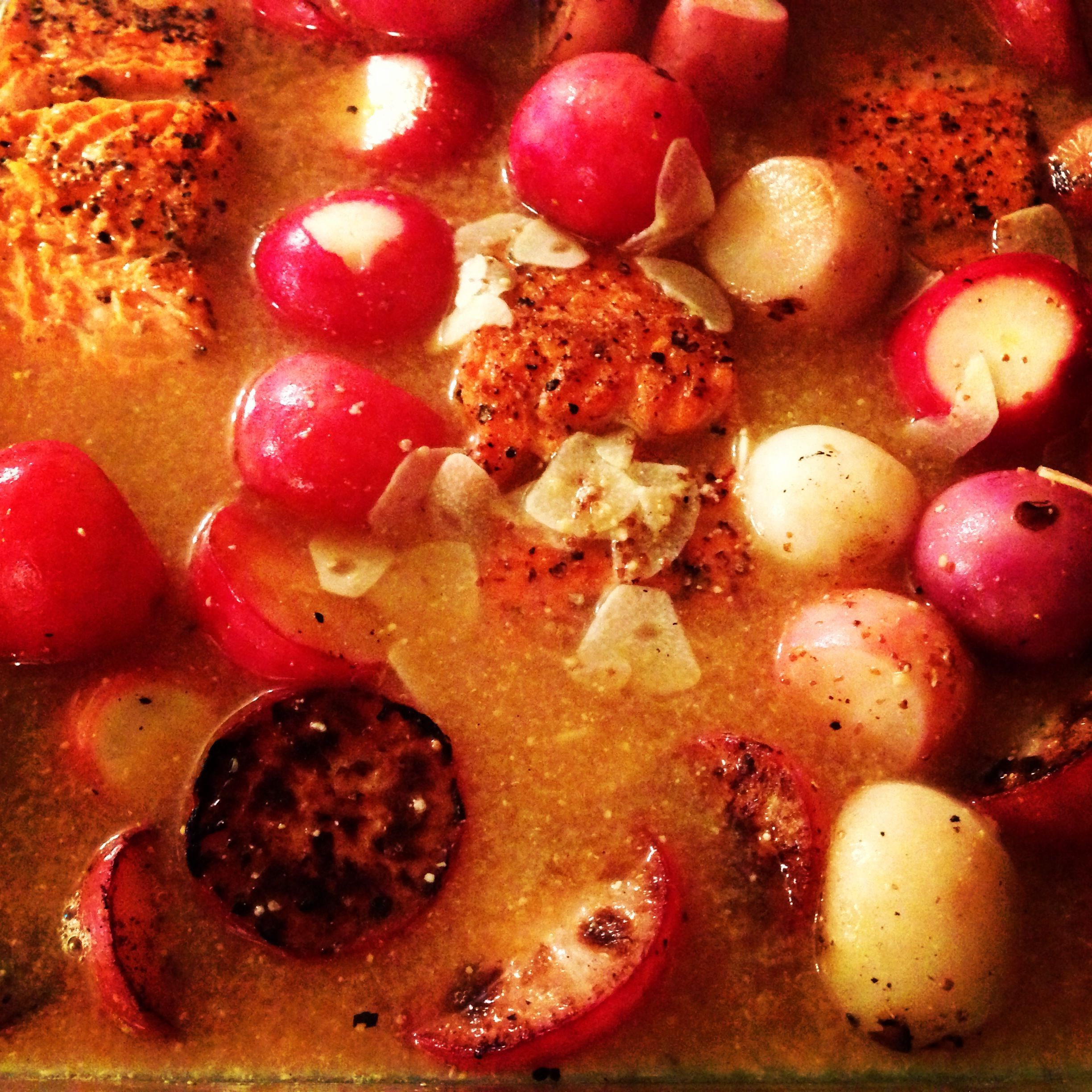Return the salmon to the pan with the radishes (you might have to move the radishes all to the sides and redistribute them to ensure a single layer), and pour the sauce over the top. Bake until cooked through, about ten minutes.