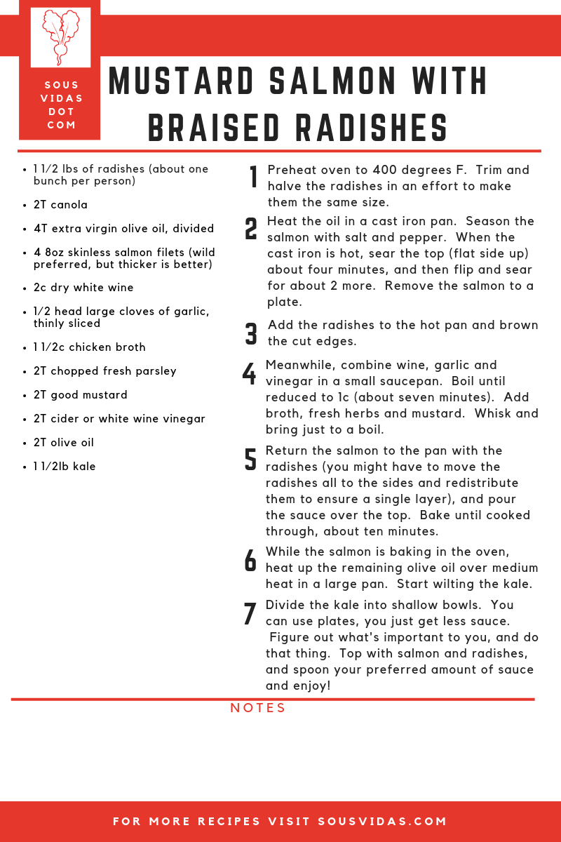I made a dish like this in 2004 for my then roommate, now husband. I’ve recently revived it by subbing in braised radishes for the potatoes. If you’re doing Paleo, it’s not strictly paleo friendly as made, as it’s got some vinegar and some mustard in it. We’re down with that variant, but I’m not your mom and I don’t know your life.