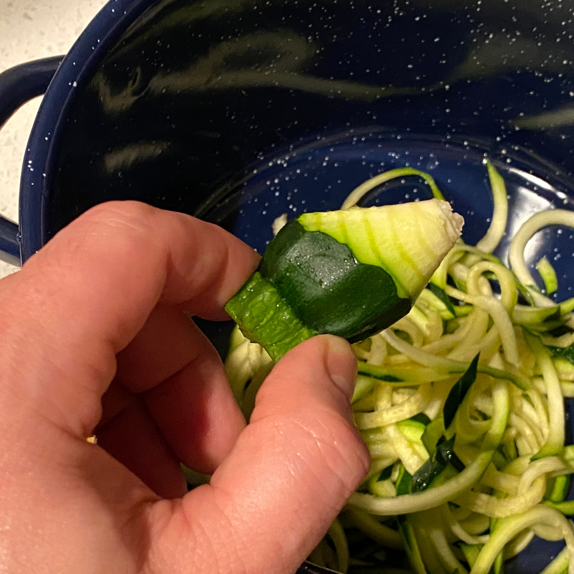 Hold your noodle tool in your non-dominant hand over your bowl or pot, and then grasp the stem of the zucchini with your dominant hand. Next, twist the zucchini (or the noodle maker) in your hand and let the noodles fall into your vessel. When your zucchini is reduced to a little veggie nubbin, toss it in your compost bowl and tamp out the core of the zucchini that emerges from the other end. The zucchini core that remains makes for a nice mid-preparation snack!