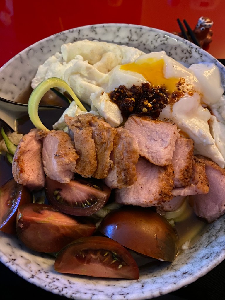 The noodle maker we’re using provides two options for veggie noodle thickness. For our ramen dish, we’re using the thicker setting so the noodles hold their shape in the hot ramen broth. Experimenting on different veggies and different thicknesses will help you find what works best for you.